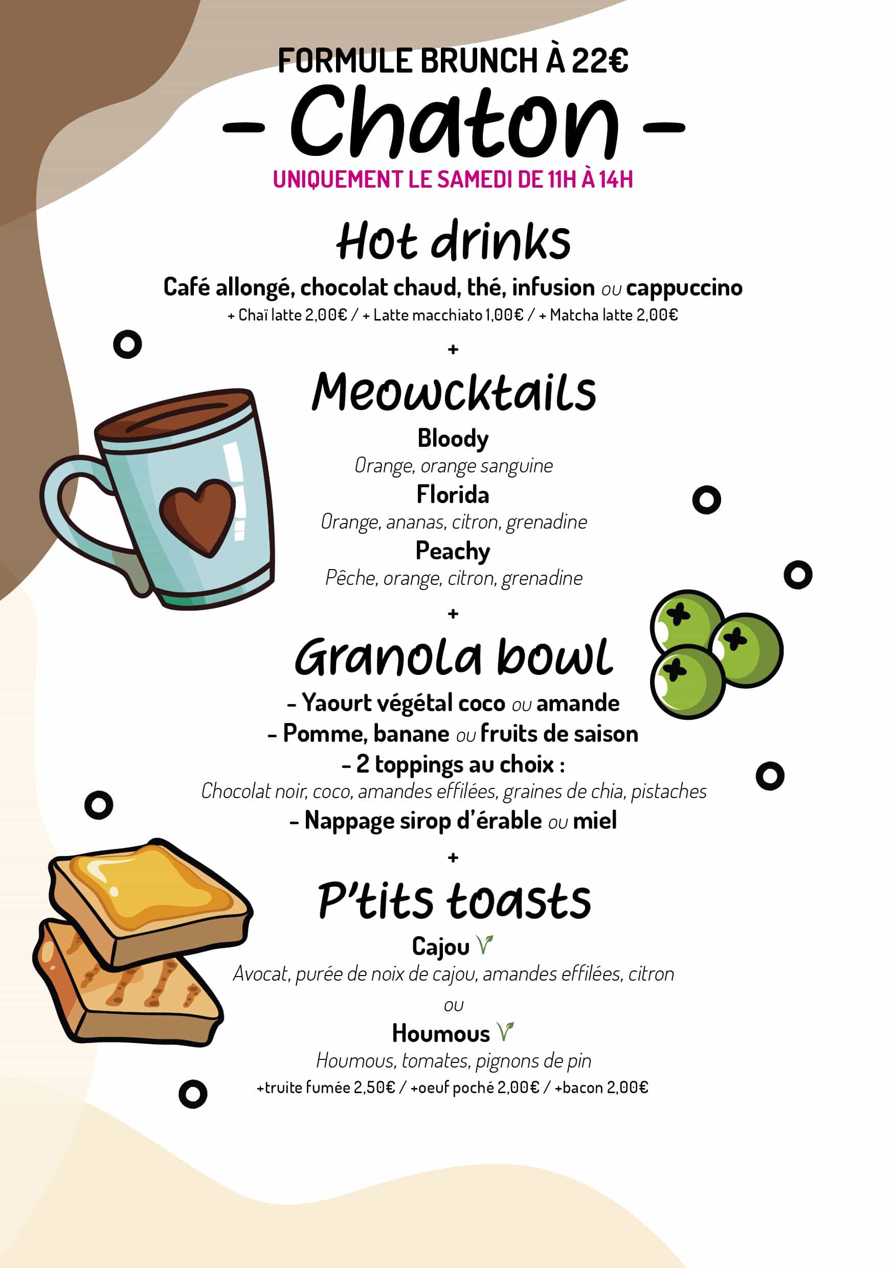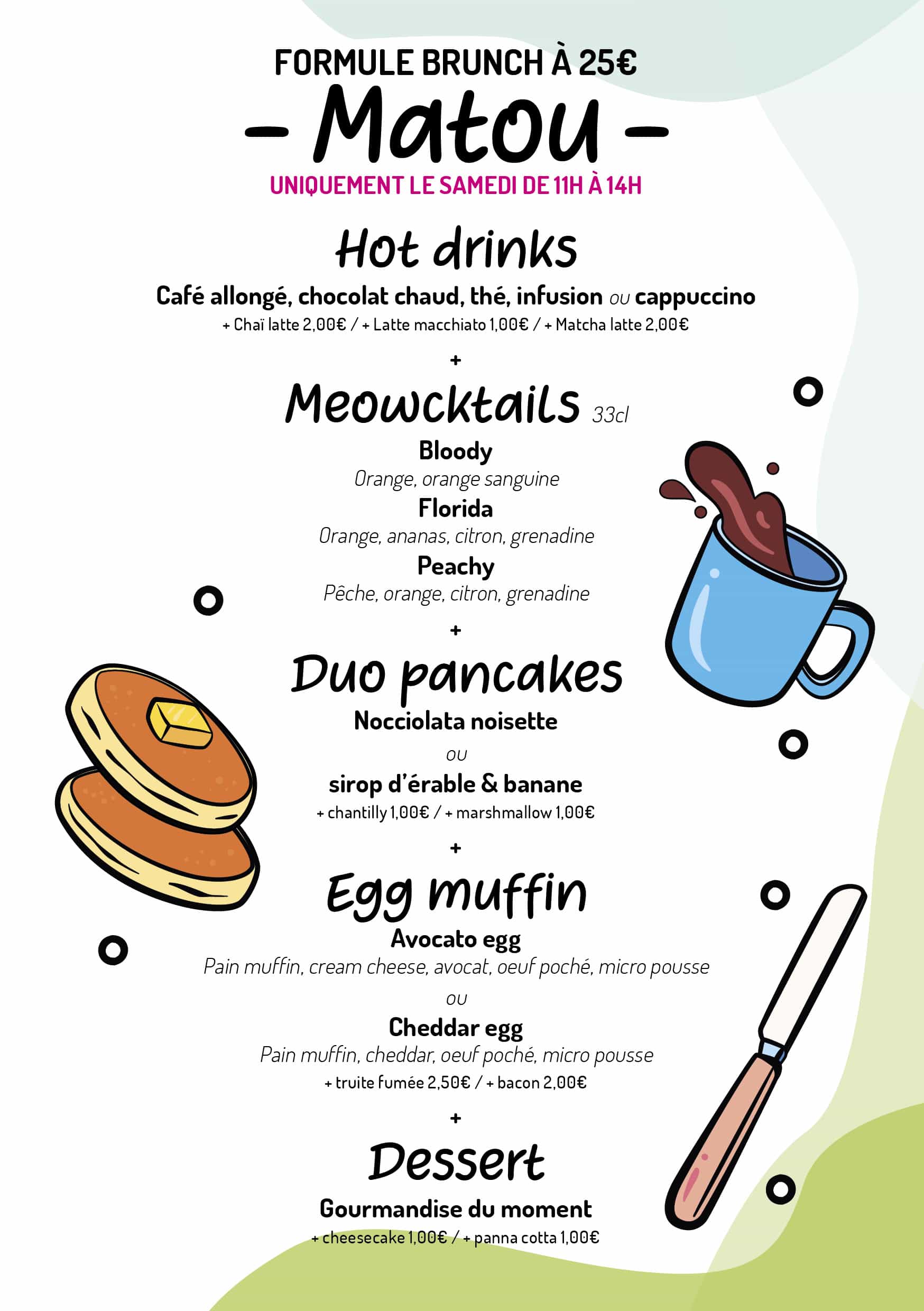 Venez bruncherau Meow Cats Café !Servi uniquement le samedi de 11h à 14h, avec ou sans réservation, nous vous proposons deux formules pour combler vos envies de brunch du week-end ! Psssst...Découvrez aussi notre menu !La carte
